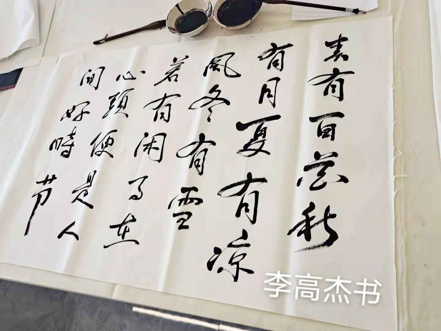 書法作品內容豐富。既有李白、蘇軾等的名篇名句,又有毛澤東主席的詩詞,還有警示名言、公司宣傳標語、部門口號等。