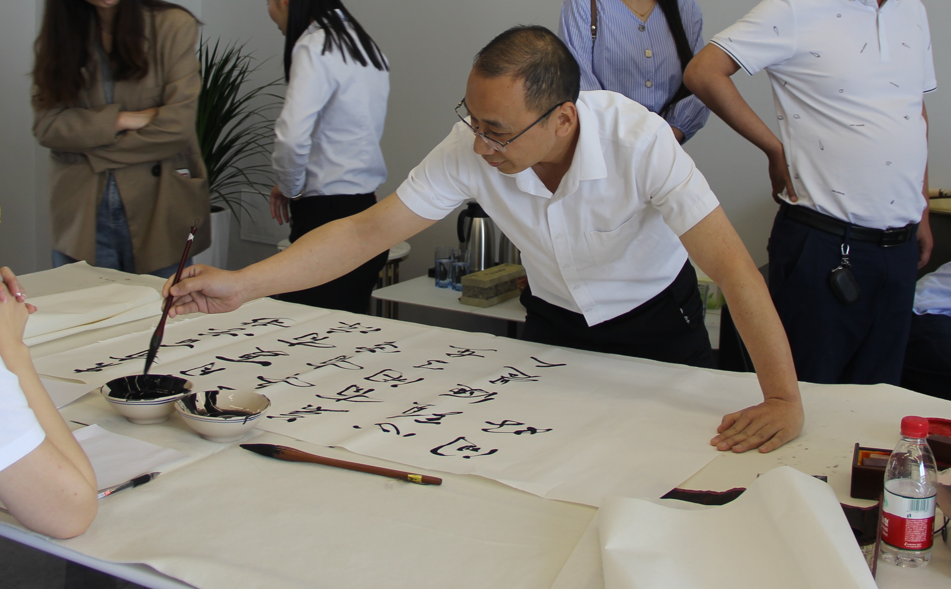 公司董事長馬紅菊、總經理曲洪普親臨現場,觀摩書法家的創作。與書法家交流、探討書法藝術,談笑風生,沉浸在藝術的海洋中。