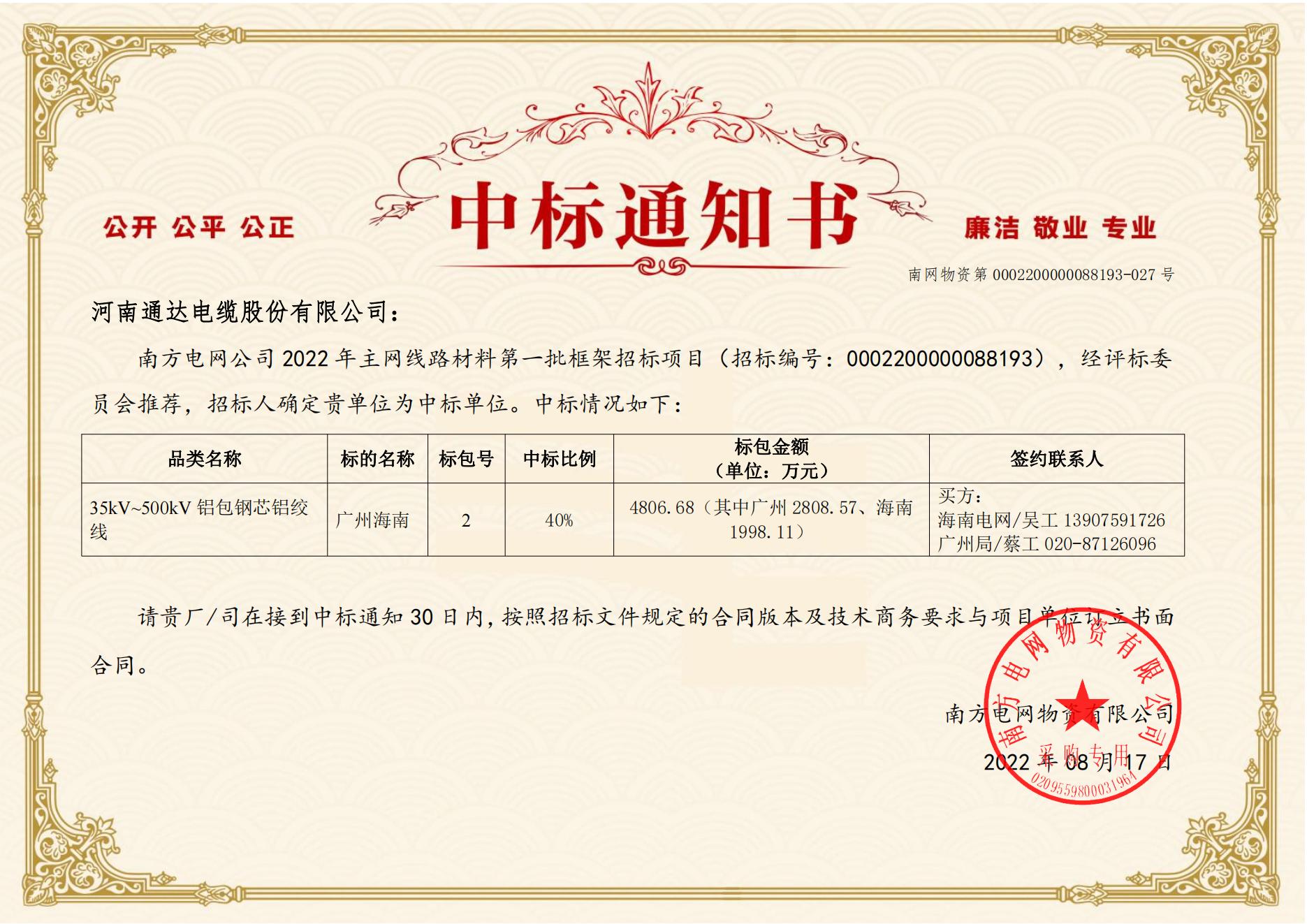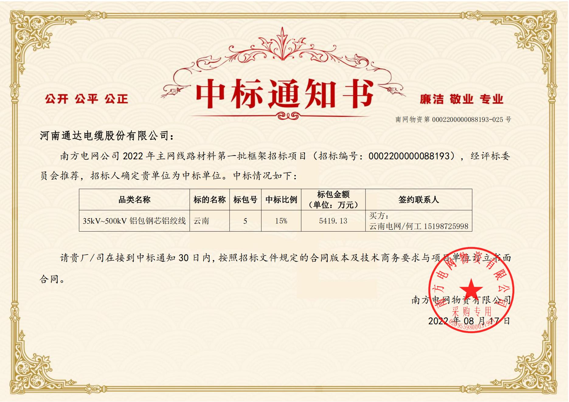 我公司於2022年8月17日收到南方電網公司2022年主網線路材料第一批框架招標項目中標通知書,中標金額達2.54億元。