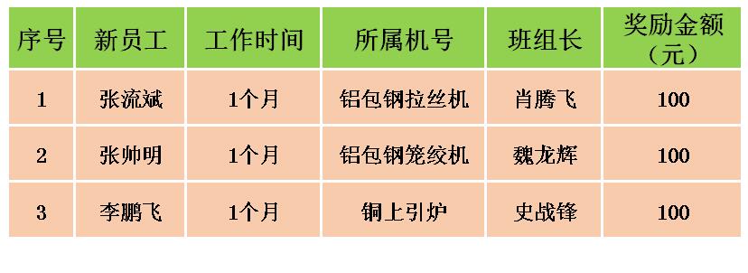 絞合車間:6號絞合機員工在本月工作中在質量、生產、7S方麵表現突出被公司評為優秀三好班組:共6人(張丙亮 李奇傑 魏亞東 趙紅星 李建剛 曲帥鵬)。