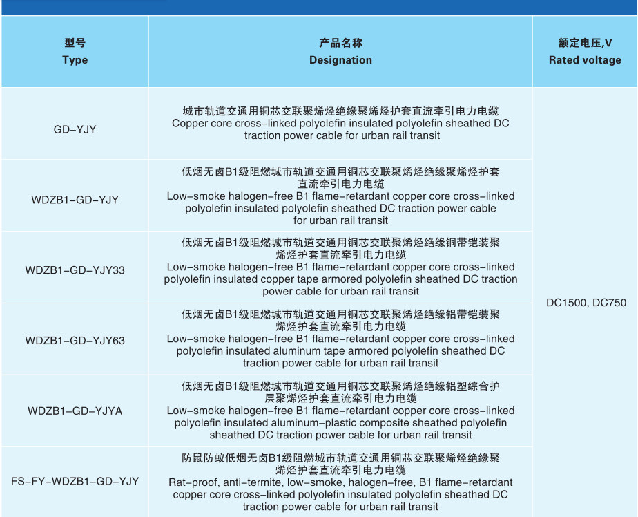 適用於額定電壓1500V及以下城市軌道交通係統的直流電力傳輸,主要用於地鐵、輕軌供電係統中牽引變電站到接觸網的供電。